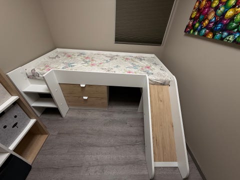 Seng i tre med madrass gi bud