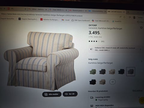 Belysning (43 112)Bord og stoler (49 780)Dekorasjon og pyntegjenstander (148 538)Garderobe og skap (10 561)Hyller og kommoder (23 756)Kjøkkenutstyr og serviser (142 006)Pynt til høytider og fest (32 886)Senger og madrasser (11 173)Sofaer og lenestoler (27 777)Tepper og tekstiler (46 133)Annet (26 459)