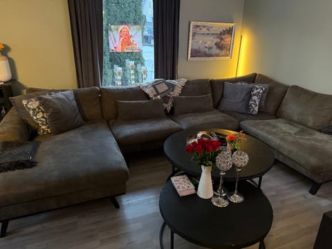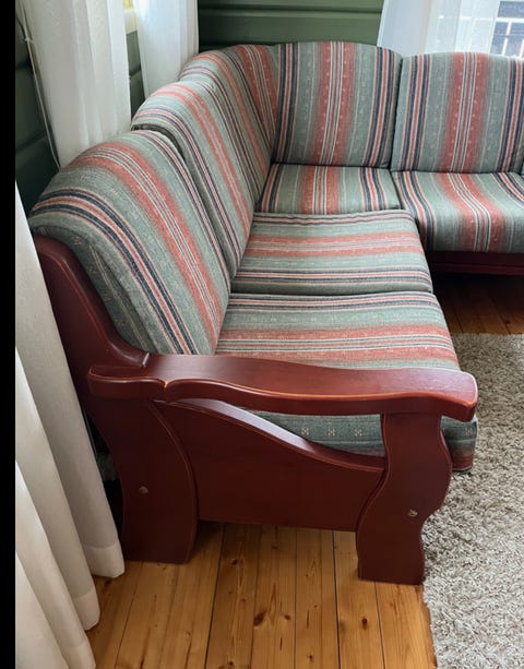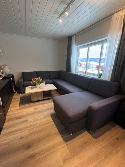 Hjørnesofa og teppe gis bort