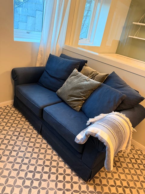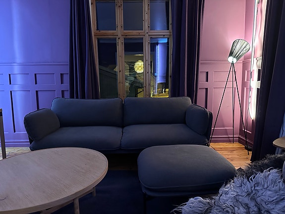 Bolia North 3-seters sofa i mørk blå med tilhørende puff.