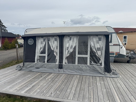 Fortelt til campingvogn med gardiner står på Flisa camping.