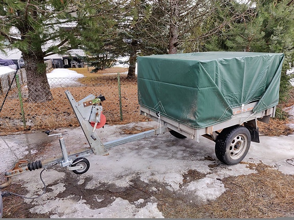 Liten allsidig Brenderup tilhenger med høye karmer, presenning og båtstøtte