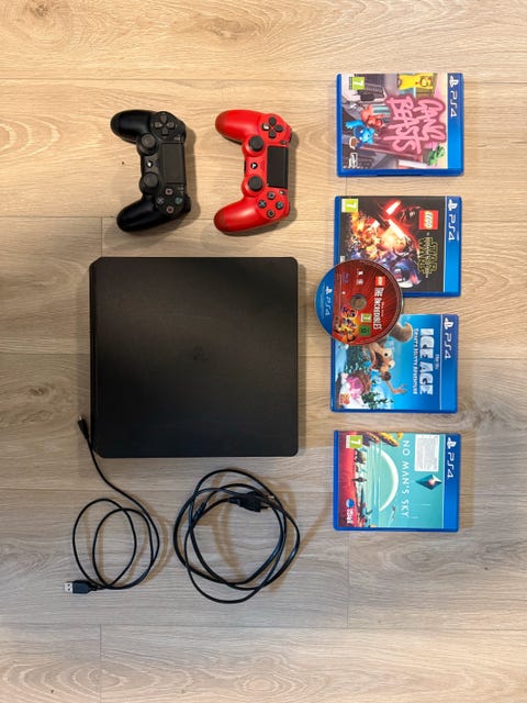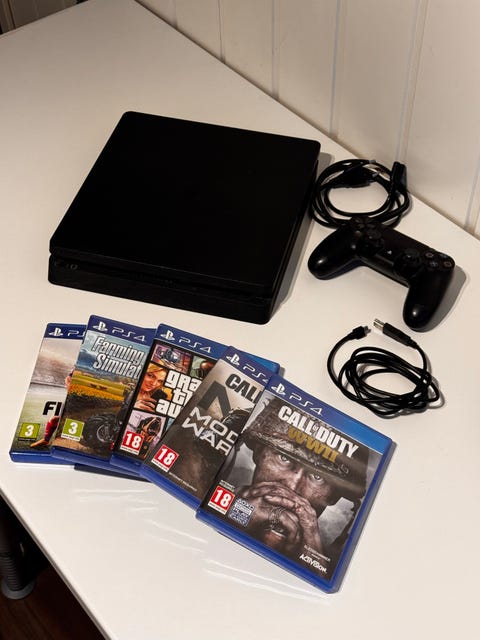 Pent og lite brukt Playstation 4, PS4 slim black 500 GB, en kontroller, 3 spill