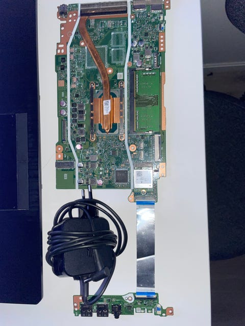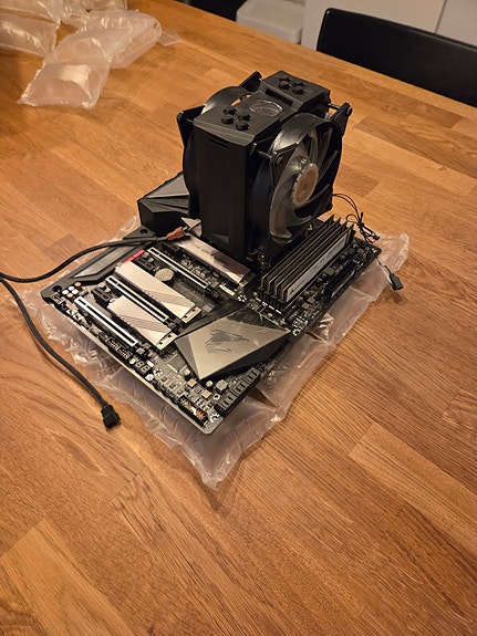Hovedkort, med CPU, CPU-kjøler, 4x DDR4 RAM, og WIFI-antenne