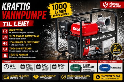 💧🔥 Kraftig lensepumpe / vannpumpe til leie – 1000 L/min!