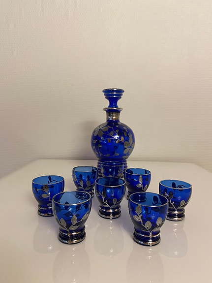 Antikk italiensk blå karaffel og glass