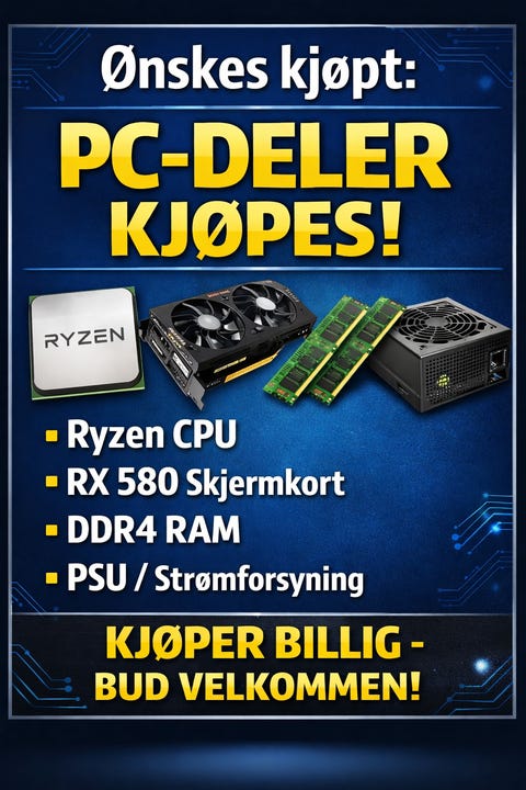 1 500 krØnskes kjøpt: Billige PC-deler (Ryzen / RX 580 / DDR4 RAM / PSU)Koppang4 dg.Legg til som favoritt.