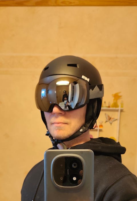 Hjelm, briller og buff