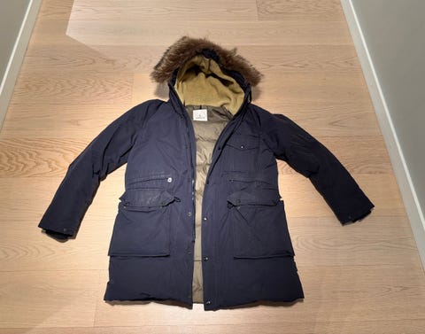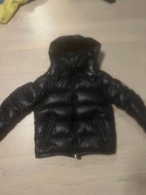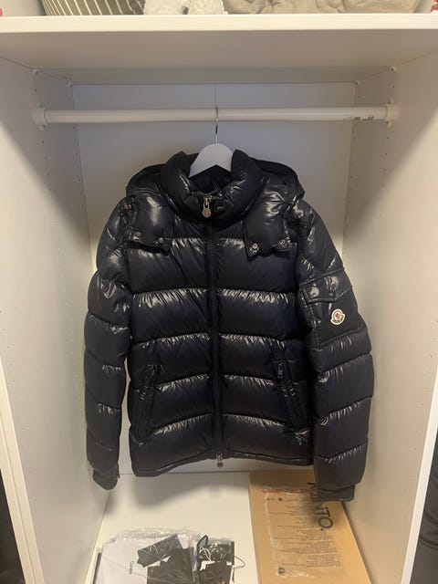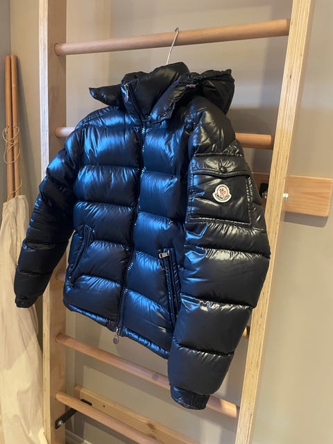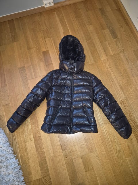 Mørkeblå Moncler dunjakke størrelse T 2 fra slutten av åttitallet. Må repareres.