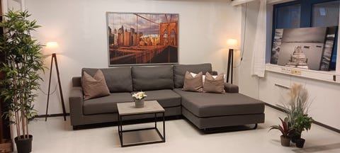 Grå hjørnesofa med sjeselong