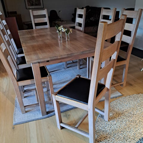 Spisebord og 6 stoler i eik