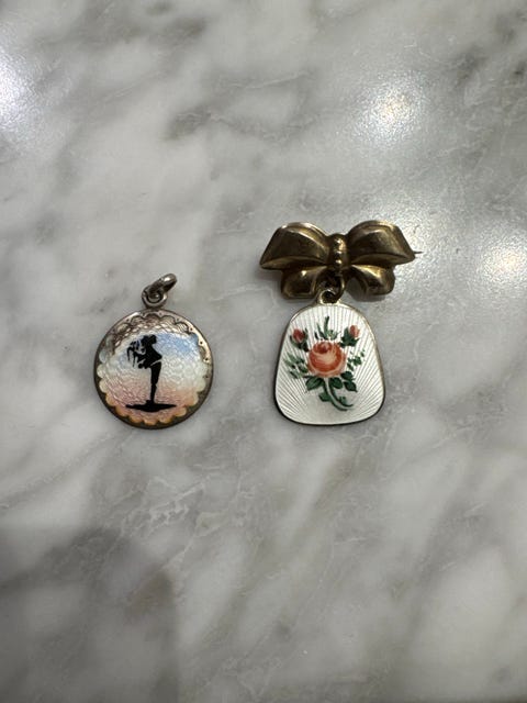 David Andersen brosje og eldre anheng i sølv og emalje selges samlet kr 1000,-