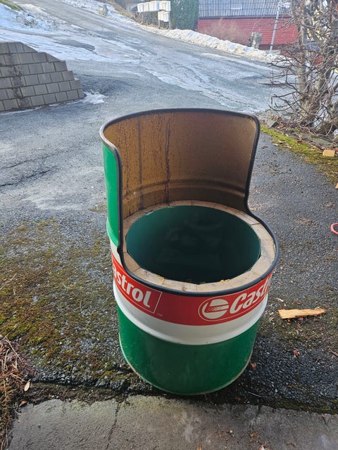 Påbegynt oljefatstol gis bort