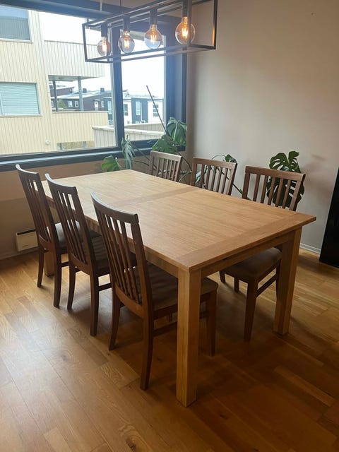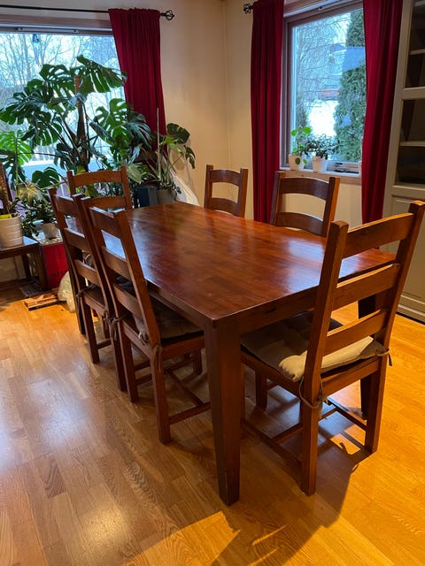 Spisebord i tre + 8 stoler