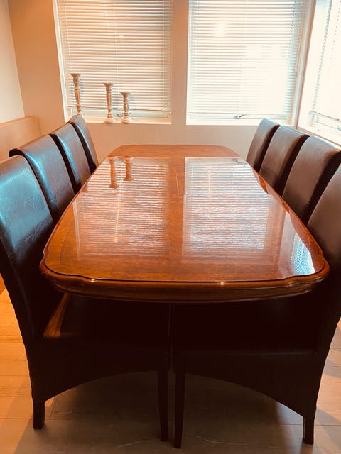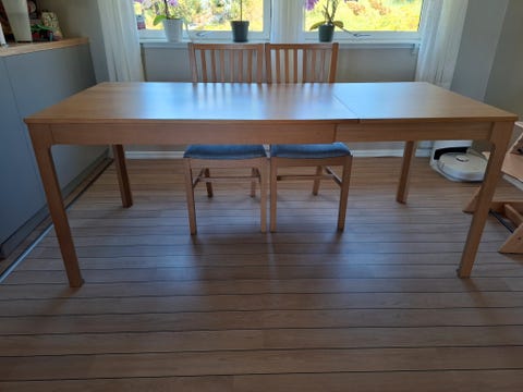 Bord + 8 stoler + 2 klaffer