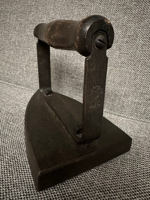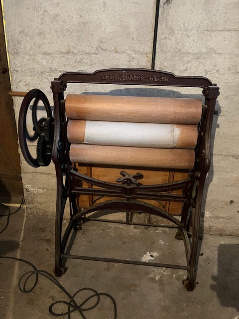 Antikk klesrulle i metall og tre