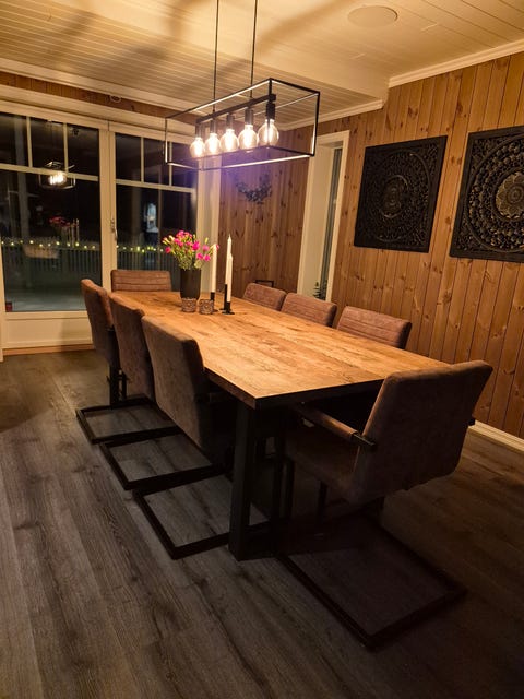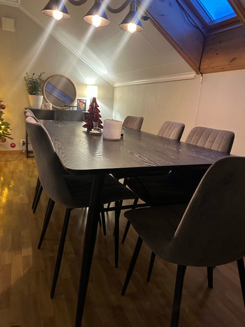 Bord, klaffer, 8 stoler og lampe