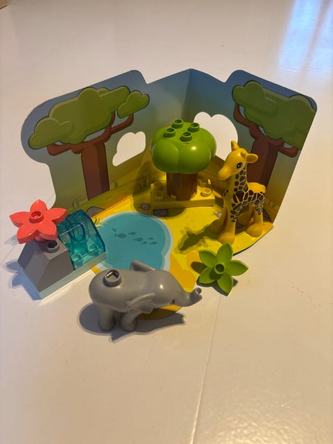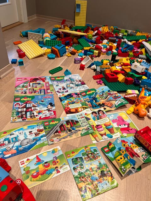 Ekstra deler til Lego duplo trillebår, blomst,gress, banan, øks,spade, hjul, fly