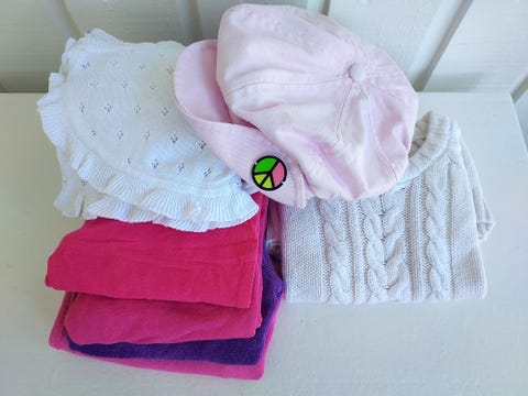 Klespakke. En kjole, fire bukser, jakke og hatt med peace-merke på. Str. 86