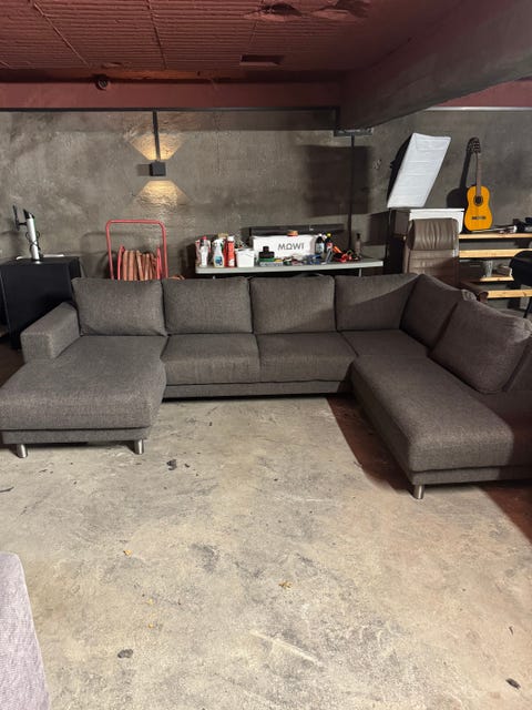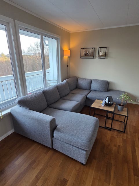 Grei sofa med sjeselong selges