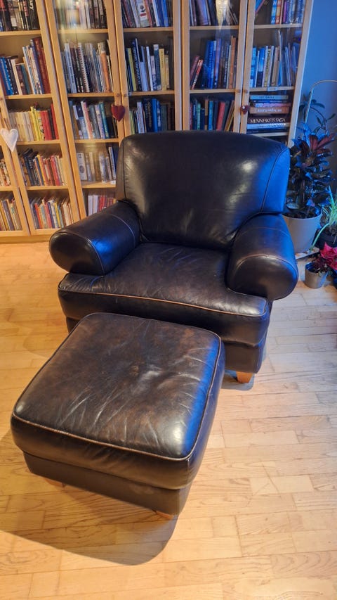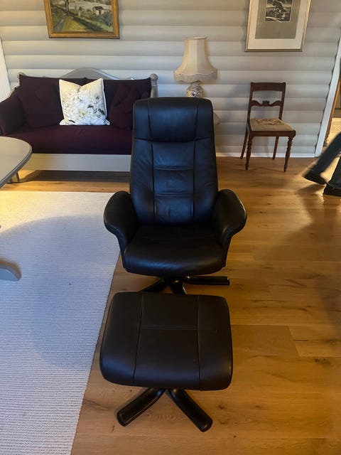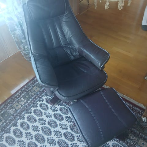 Lenestol i skinn med fotskammel.