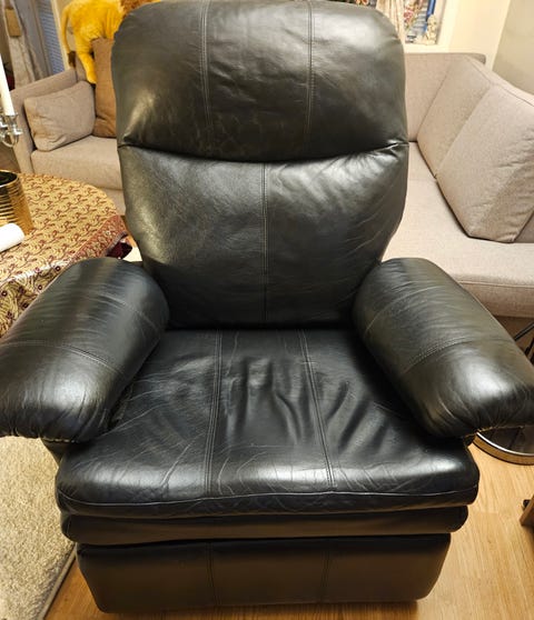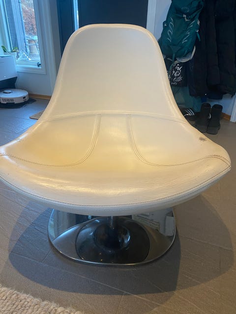 Lenestol i skinn gis bort.