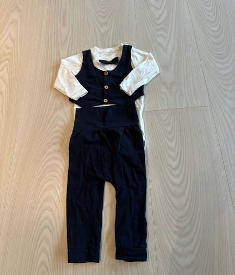 Penklær til jul eller nyttår. Svart bukse og to hvite skjortbody Str 80 Gutt