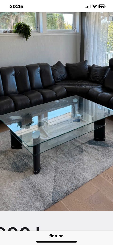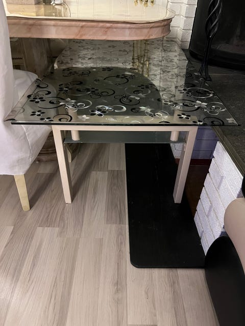 Glass stue bord med hylle.