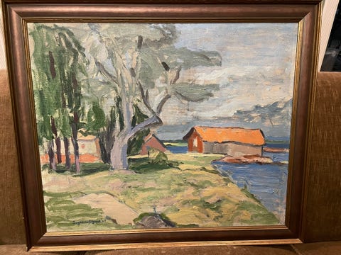 Maleri Landskap med hus og trær