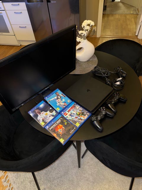 PS4 Slim komplett pakke + 2 kontrollere + 5 spill + skjerm/monitor – tipp topp!