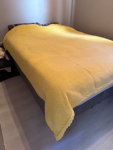 Hjemmestrikket teppe til seng