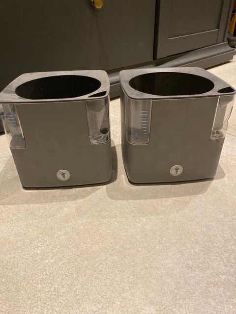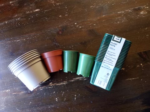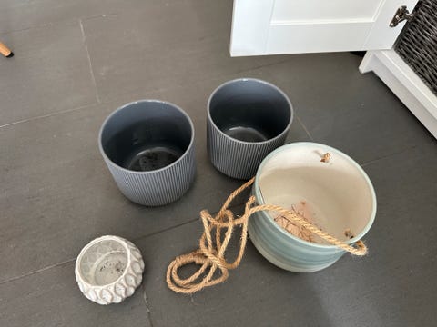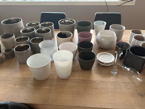 En haug med plastpotter gis bort