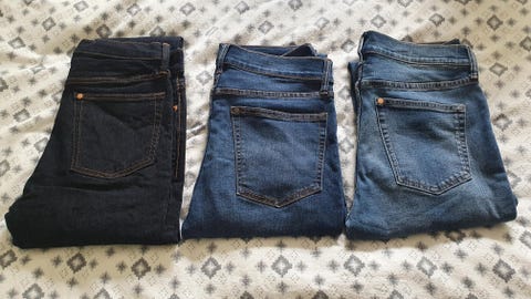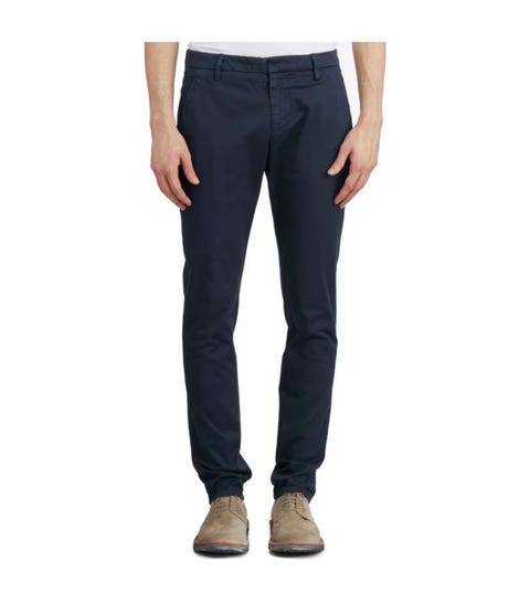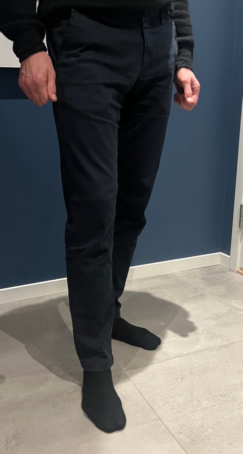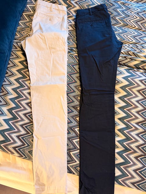 Blå jeans, beige chinos