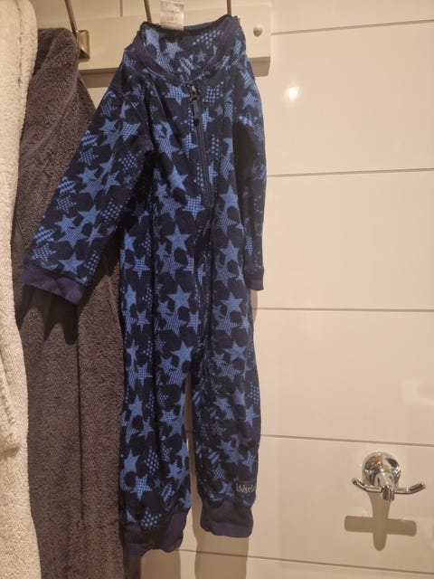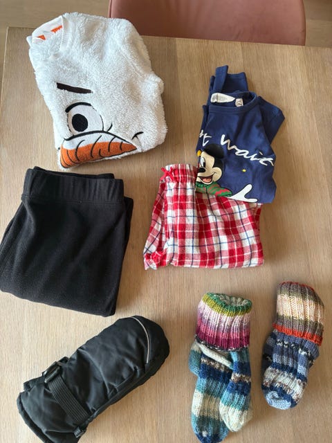 Mikke genser, fleece genser, fleece bukse, rutete pysjbukse, votter og ullsokker