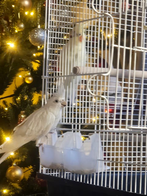 2 papegøyer og bur selges