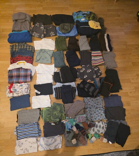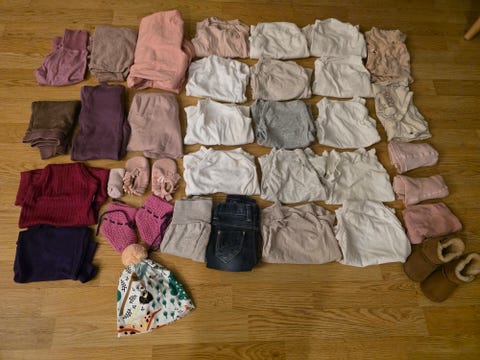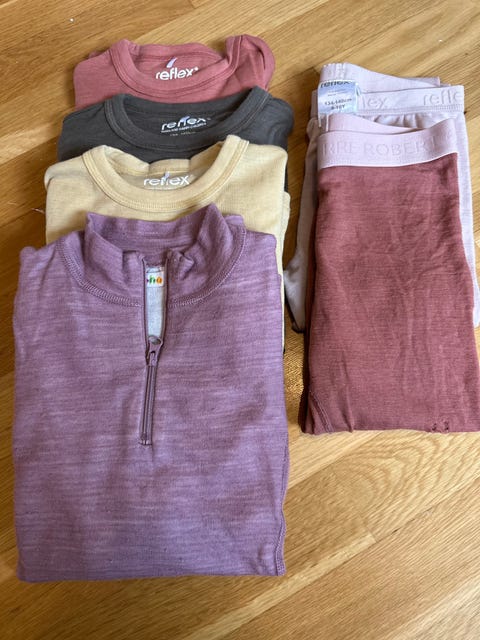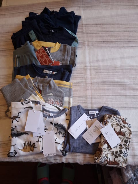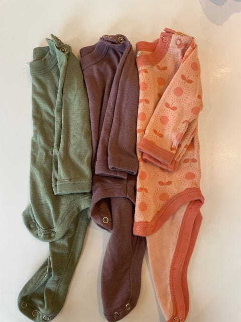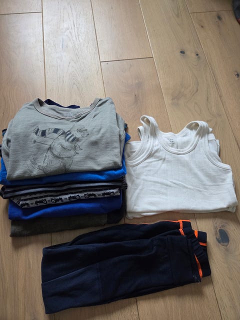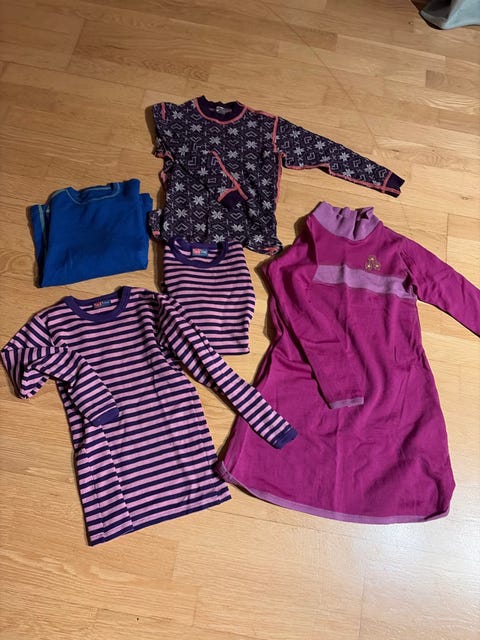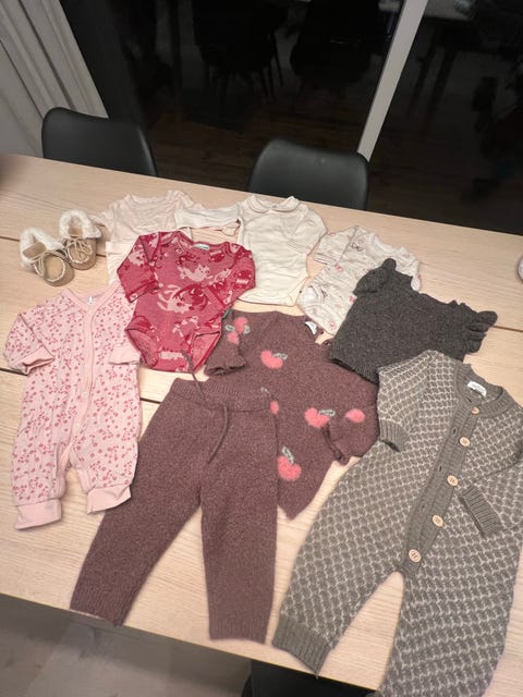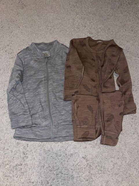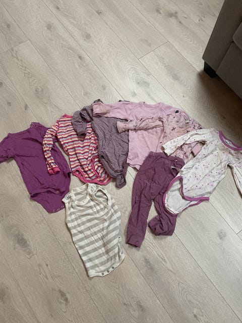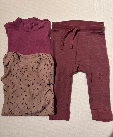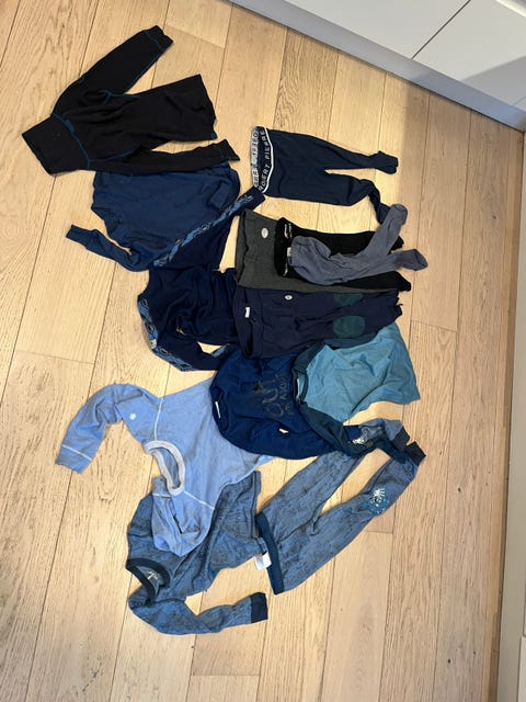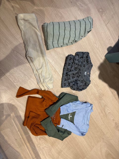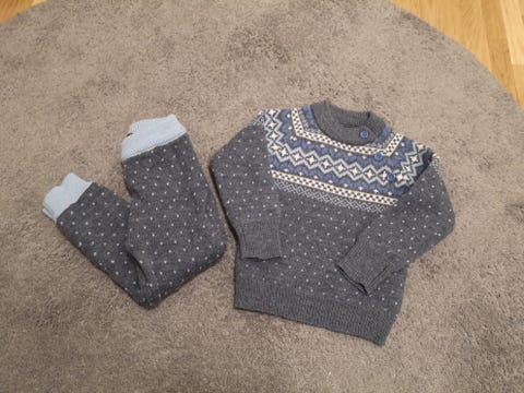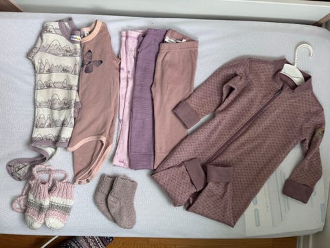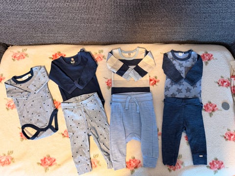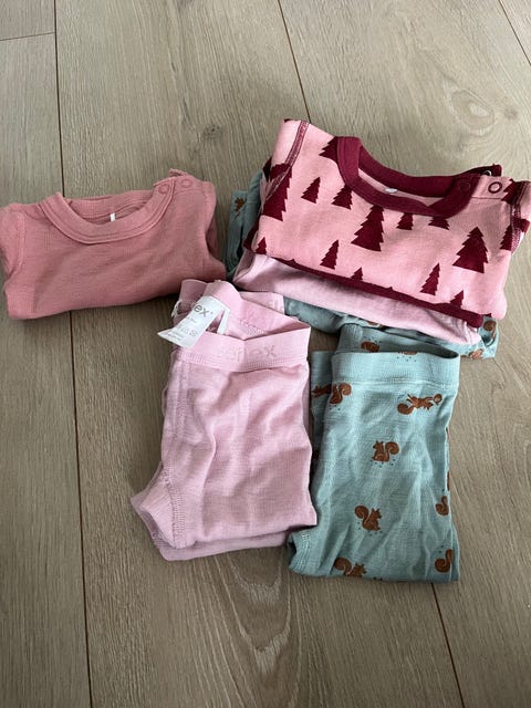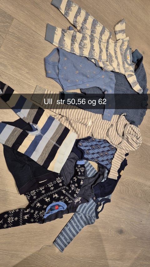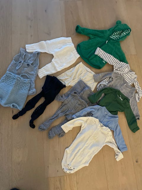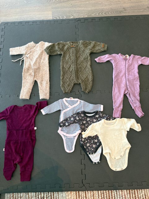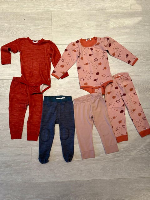Klespakke i ull str 62/68. Lillelam romper, bukser, lue, pysj, devold sokker
