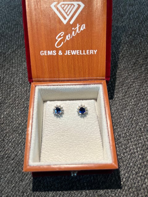 Evita Gems & Jewellery. 0,6k Safir øredobber med 14 diamanter og 14K hvitt gull
