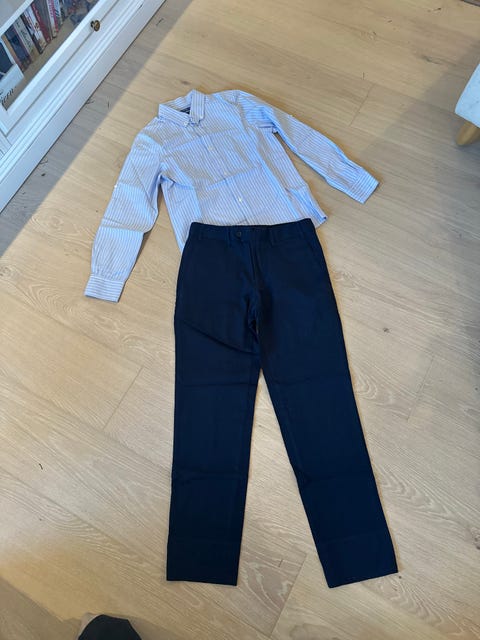 Mørk blå ull Mario Conti penbukse str B2-42,lys blå skjorte med striper str 152