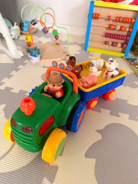Traktor med bonde og dyr