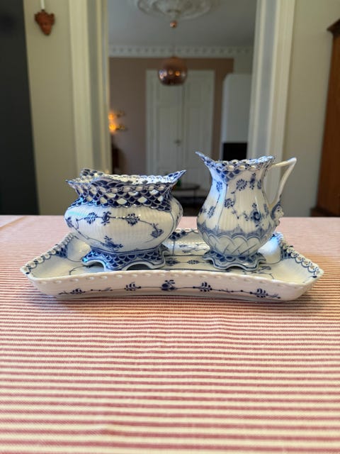 Musselmalt helblonde - sett fra Royal Copenhagen – sukkerskål, fløtemugge og fat