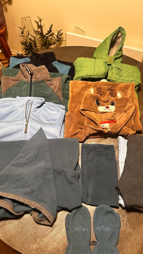 Klespakke primært ull 1-3 år med luer, halser, votter og strikket bukse.