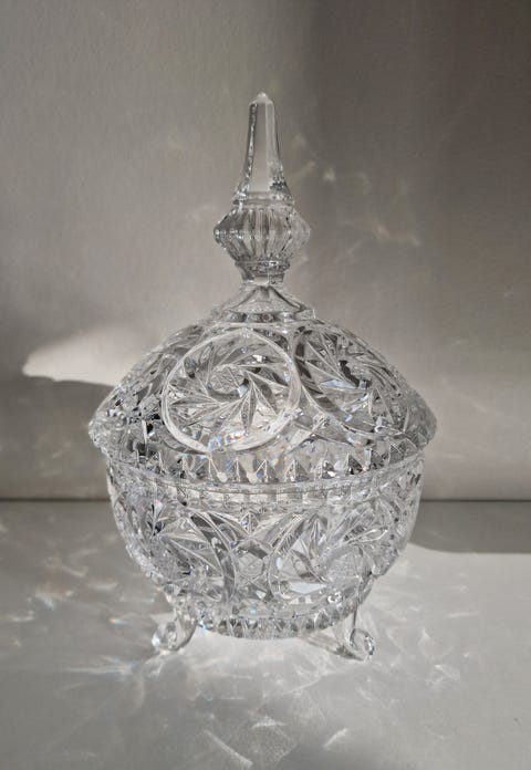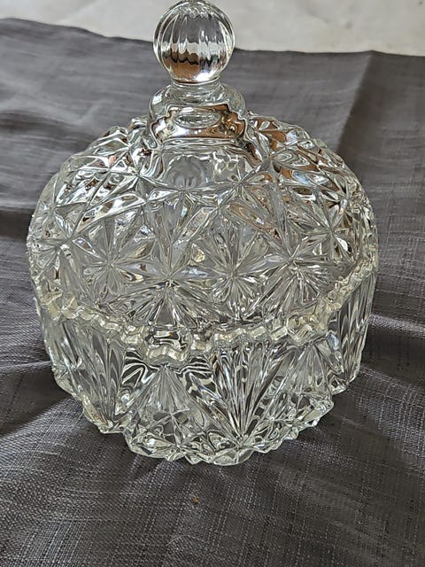 Vakker krystall skål med lokk.