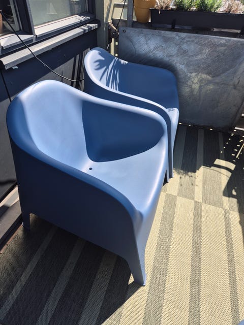 Utemøbler i plast gis bort