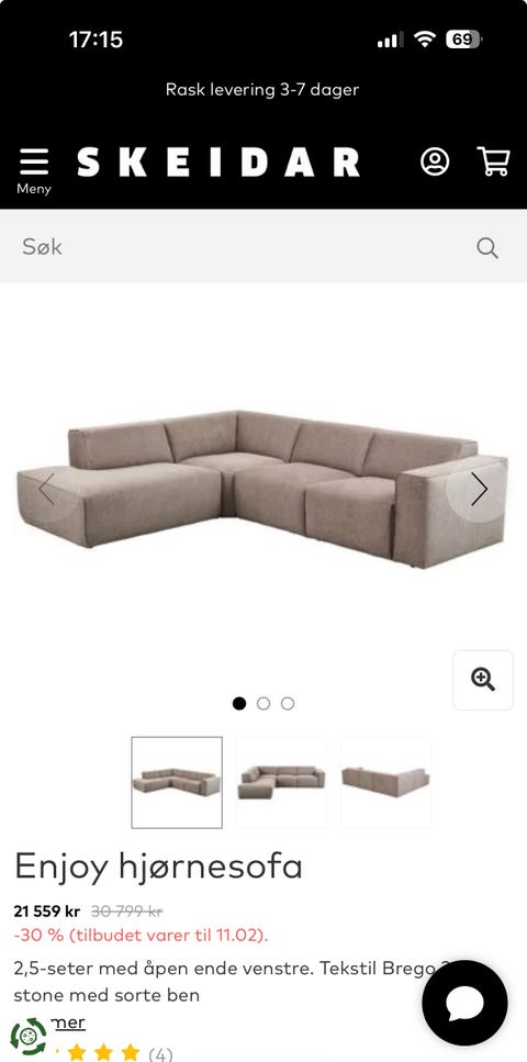 Hjørnesofa 288 x 343 x 150 h 78 d 86