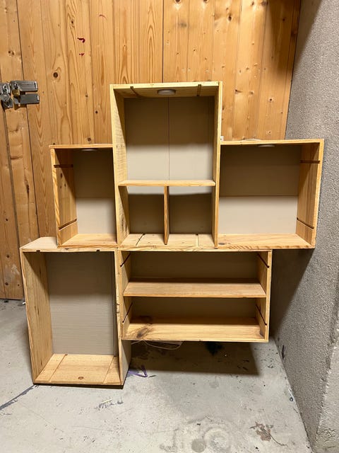 Hylle av vintage vinkasser