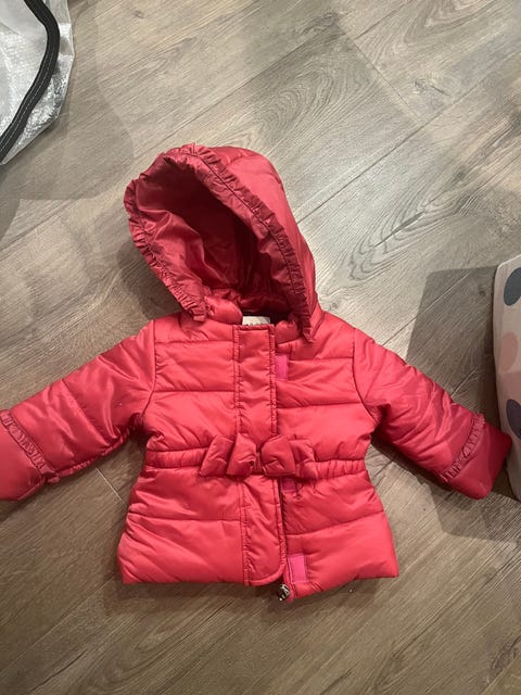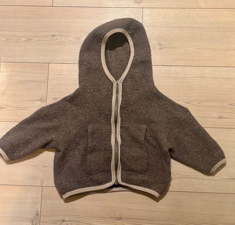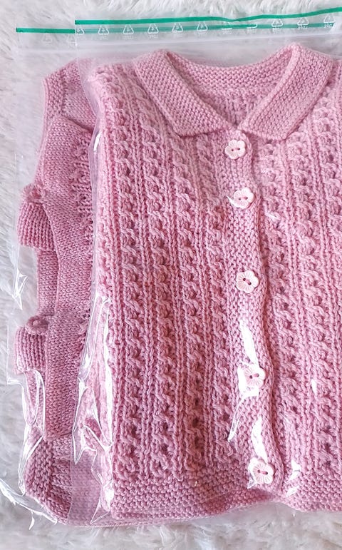 Rosa strikket sett. Bukse og jakke. Oppfatter garnet som babyull. Ca str. 56-62