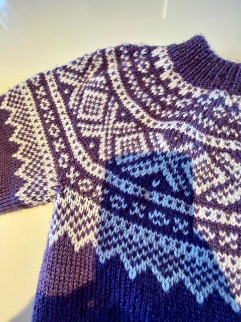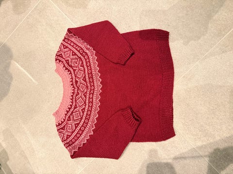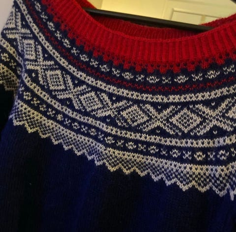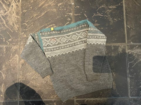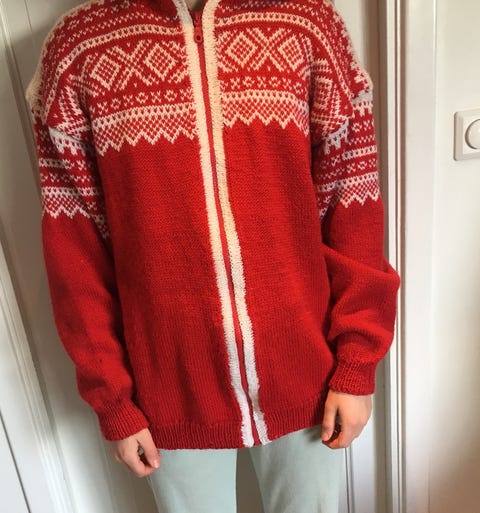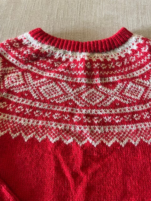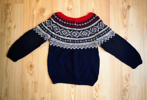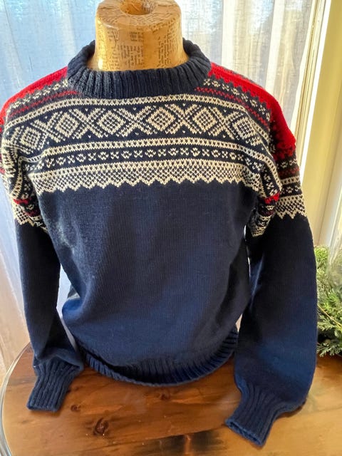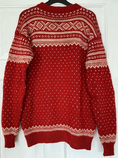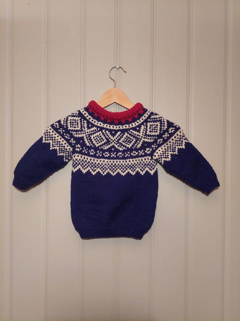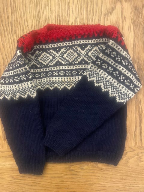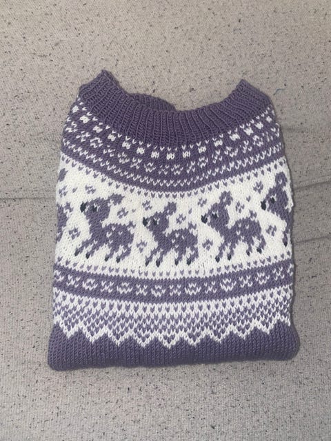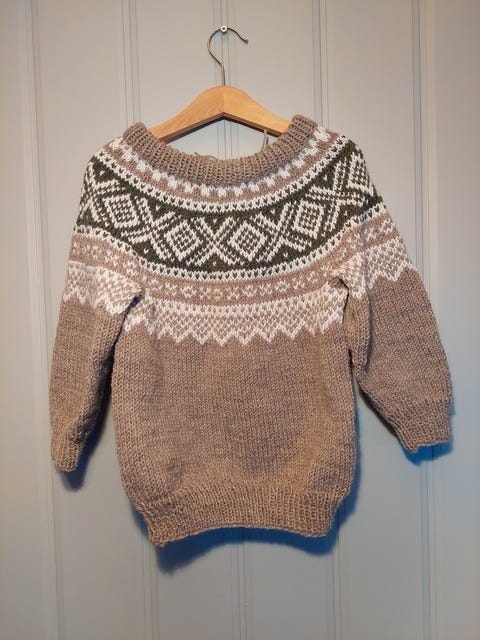 Ny hjemmestrikket Bambi/Mariusgenser m rådyr,6-7/8 år,100% tynn merinoull