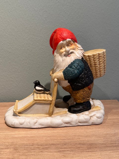 Midthun nisse med spark og fugl.