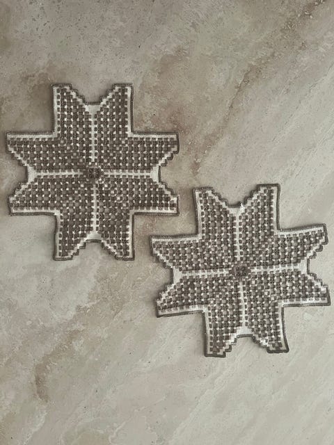 Håndlaget heklebrikker.