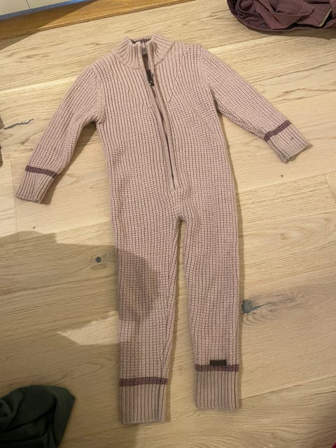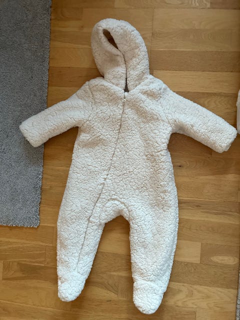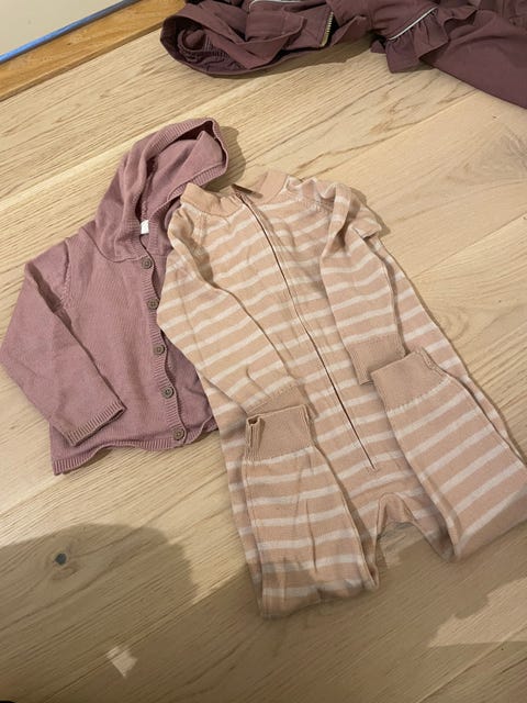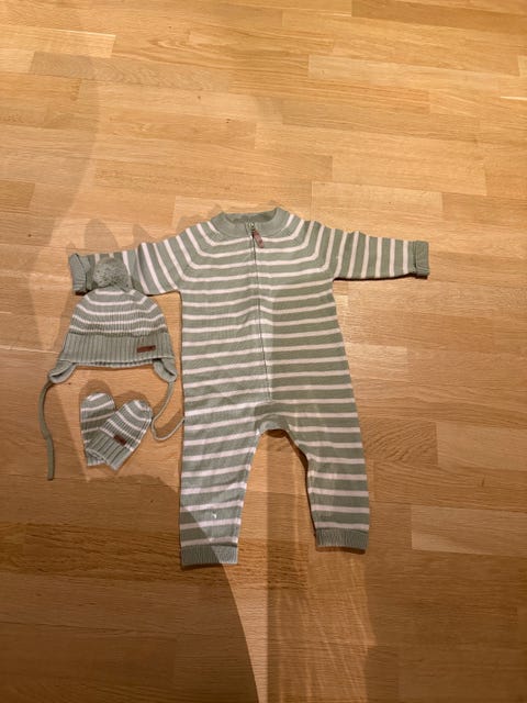 Rød heldress (newbie) med matchende lue i str. 80 og en heldress i str. 86 u/lue